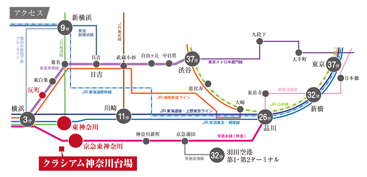 横浜駅まで3分、品川駅まで26分、川崎駅まで約11分、羽田空港(第1・第2ターミナル)へ約32分。